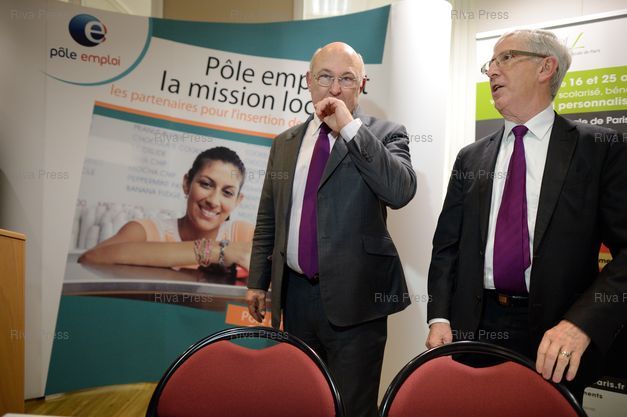 Légende : Michel Sapin, ministre du Travail, se rend dans l'agence de Pôle Emploi Paris Bercy dans le cadre du nouveau suivi des chômeurs.