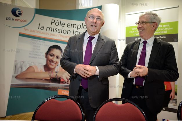 Caption : Michel Sapin, ministre du Travail, se rend dans l'agence de Pôle Emploi Paris Bercy dans le cadre du nouveau suivi des chômeurs.