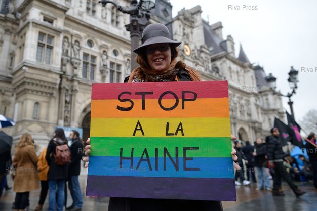 Légende : Rassemblement contre l'homophobie et pour l'égalité des droits, à l'initiative d'Act-Up Päris et du collectif Oui oui oui, pour dénoncer la recrudescence de la haine et des actes à caractère violent à l'encontre des homosexuels - place de l'Hôtel de Ville de Paris - Paris - 10/04/2013 - Photo © Lionel Préau +33 (0)6 68 12 83 77