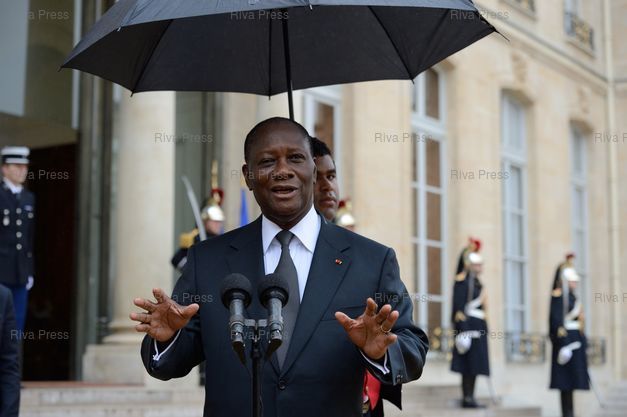 Légende : François Hollande reçoit Alassane Ouattara, président de la République de Côte d'Ivoire, pour un entretien au palais de l'Elysée. Alassane Ouattara vient s'exprimer devant les journalistes - Paris - 11/04/2013 - Photo © Lionel Préau +33 (0)6 68 12 83 77