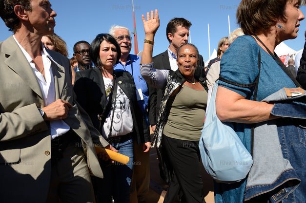 Légende : Université d'été du Parti Socialiste. Christiane Taubira salue les militants, accompagnée par Marie-Pierre de la Gontrie - La Rochelle - 24/08/2013 - Photo © Lionel Préau +33 (0)6 68 12 83 77