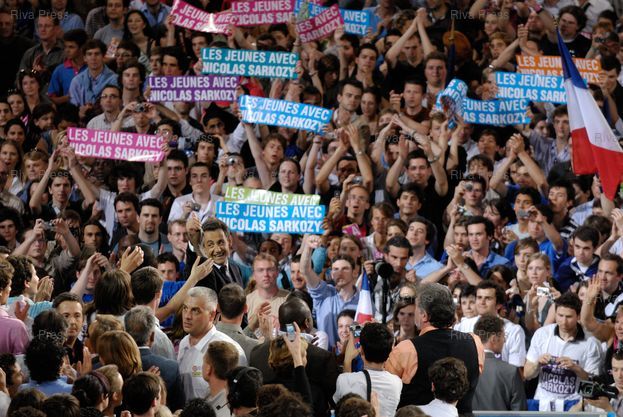 Légende : Meeting de Nicolas Sarkozy, candidat UMP à l'élection présidentielle, au palais omnisport de Paris-Bercy.