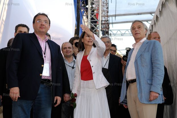 Ségolène Royal quitte la scène après son discours, accompagnée par Patrick Mennucci et François Rebsamen - Paris - 01/05/2007 - Photo © Lionel Préau +33 (0)6 68 12 83 77