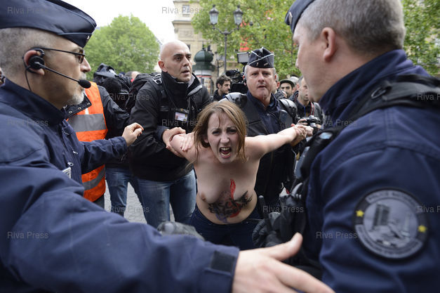 Action de militantes des Femen avant le départ du défilé - Paris - 01/05/2014 - Photo © Lionel Préau +33 (0)6 68 12 83 77