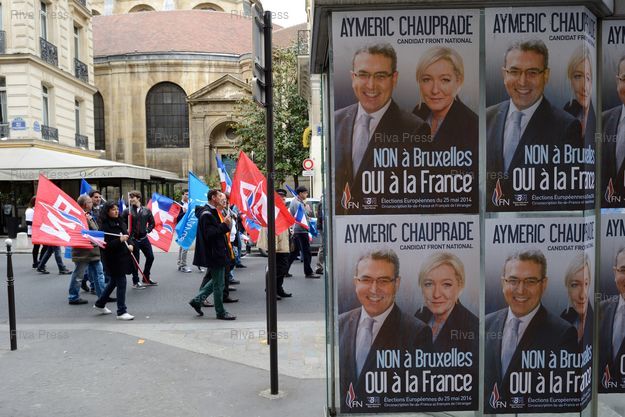 Mots-clés : 2014, Affiche, Aymeric Chauprade, campagne, Defile, elections, Européennes, FN, Front national, Marine Le Pen, Paris
