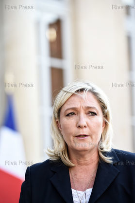 Légende : Marine Le Pen, présidente du Front national, est reçue par le président François Hollande dans le cadre des consultations sur le projet de réforme territoriale.