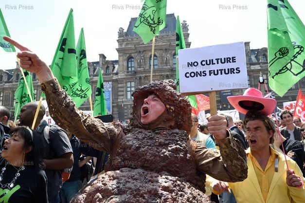 Légende : Manifestations des intermittents à l'appel de la CGT-Spectacle contre la baisse des budgets de la culture et la réforme du régime des intermittents - place du Palais Royal - Paris - 16/06/2014 - Photo © Lionel Préau +33 (0)6 68 12 83 77