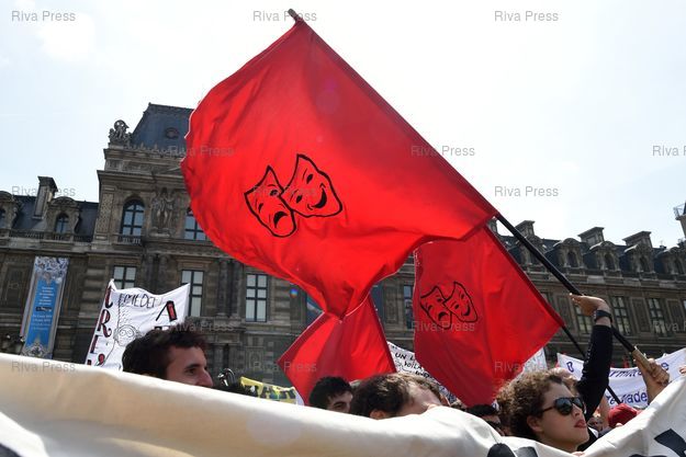 Légende : Manifestations des intermittents à l'appel de la CGT-Spectacle contre la baisse des budgets de la culture et la réforme du régime des intermittents - place du Palais Royal - Paris - 16/06/2014 - Photo © Lionel Préau +33 (0)6 68 12 83 77