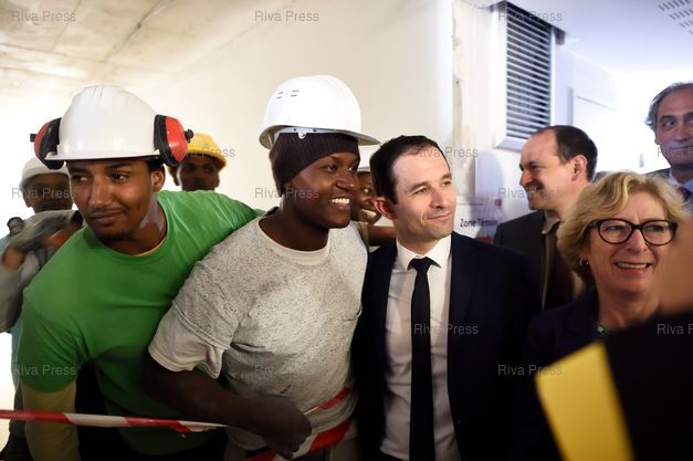 Benoit Hamon et Geneviève Fioraso visitent le site de la future résidence universitaire (318 logements à construire), et posent avec des ouvriers du chantier - Bobigny - 30/06/2014 - Photo © Lionel Préau +33 (0)6 68 12 83 77
