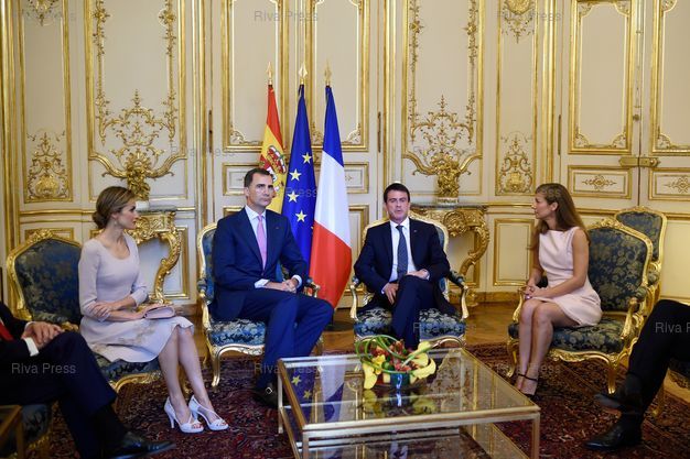 Légende : Manuel Valls reçoit le Roi et la Reine d'Espagne, Felipe VI et Letizia, pour un entretien à l'Hôtel de Matignon.