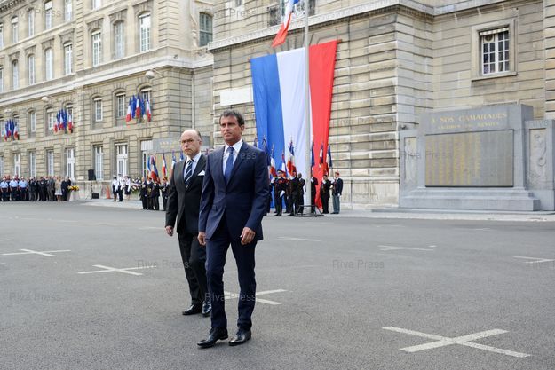 Légende : Manuel Valls préside une cérémonie d'hommage solennel à la préfecture de police de Paris en commémoration du 70ème anniversaire de son soulèvement - Préfecture de Police de Paris.