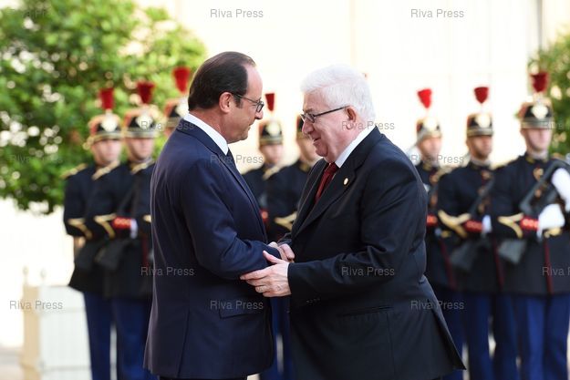 Légende : François Hollande reçoit Fouad Massoum, président irakien, pour un entretien au palais de l'Elysée, avant la conférence sur la paix et la sécurité en Irak.
