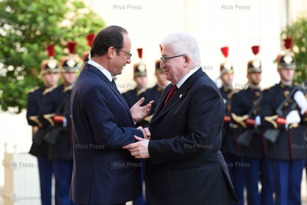 Légende : François Hollande reçoit Fouad Massoum, président irakien, pour un entretien au palais de l'Elysée, avant la conférence sur la paix et la sécurité en Irak.