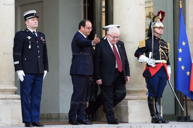 Légende : François Hollande reçoit Fouad Massoum, président irakien, pour un entretien au palais de l'Elysée, avant la conférence sur la paix et la sécurité en Irak.
