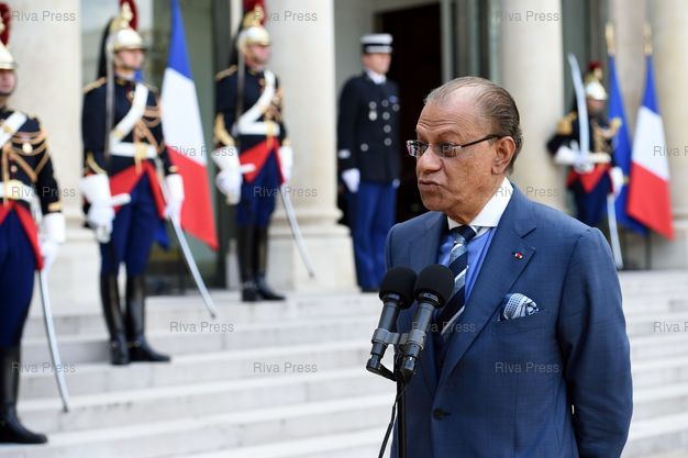 Légende : François Hollande reçoit Navin Ramgoolam, Premier ministre de la République de Maurice, pour un entretien au palais de l'Elysée.