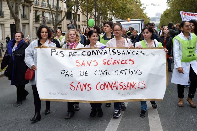 Légende : Sciences en marche - Manifestation pour l'enseignement supérieur et la recherche. Arrivée du cortège place Vauban - Paris - 17/10/2014 - Photo © Lionel Préau +33 (0)6 68 12 83 77