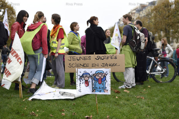 Légende : Sciences en marche - Manifestation pour l'enseignement supérieur et la recherche. Arrivée du cortège place Vauban - Paris - 17/10/2014 - Photo © Lionel Préau +33 (0)6 68 12 83 77