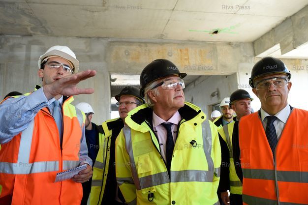 Légende : François Rebsamen, ministre du Travail, se rend sur un chantier de réhabilitation d'un ensemble immobilier sur la thématique des travailleurs détachés.