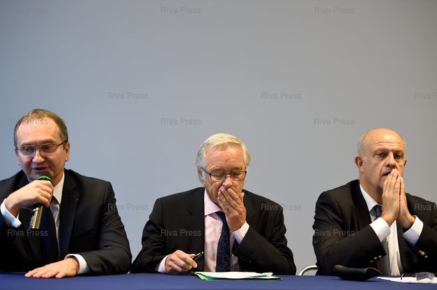 François Rebsamen entouré par Jacques Chanut, président de la Fédération française du Bâtiment, et Gilles Savary - Paris - 27/10/2014 - Photo © Lionel Préau +33 (0)6 68 12 83 77