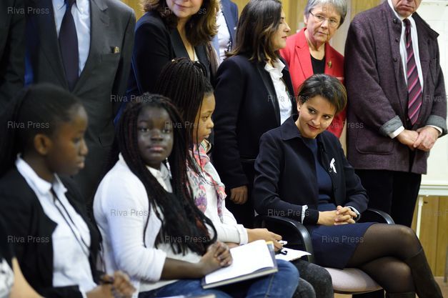 Légende : Najat Vallaud-Belkacem, Ministre de l'Education nationale, de l'Enseignement supérieur et de la Recherche, se rend au collège Germaine Tillion dans le cadre de la journée internationale de lutte contre les violences faites aux femmes, et présente les mesures envisagées pour mieux lutter contre les comportements sexistes et les violences, ainsi que les outils pour l'égalité entre les filles et les garçons à l'École.