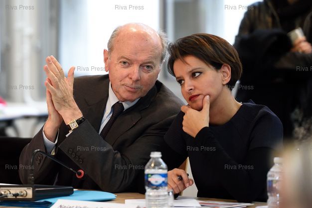Jacques Toubon, Défenseur des droits, et Najat Vallaud-Belkacem lors d'une table-ronde autour de la prévention des comportements sexistes et des violences à l'école et sur la thématique de l'égalité filles-garçons - Paris - 25/11/2014 - Photo © Lionel Préau +33 (0)6 68 12 83 77
