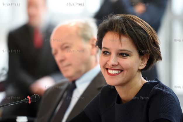 Jacques Toubon, Défenseur des droits, et Najat Vallaud-Belkacem lors d'une table-ronde autour de la prévention des comportements sexistes et des violences à l'école et sur la thématique de l'égalité filles-garçons - Paris - 25/11/2014 - Photo © Lionel Préau +33 (0)6 68 12 83 77