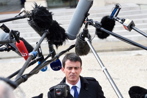 Mots-clés : 2015, Conseil des Ministres, Elysée, Journalistes, Manuel Valls, Micros, Ministre, Paris, perches, presse, valla