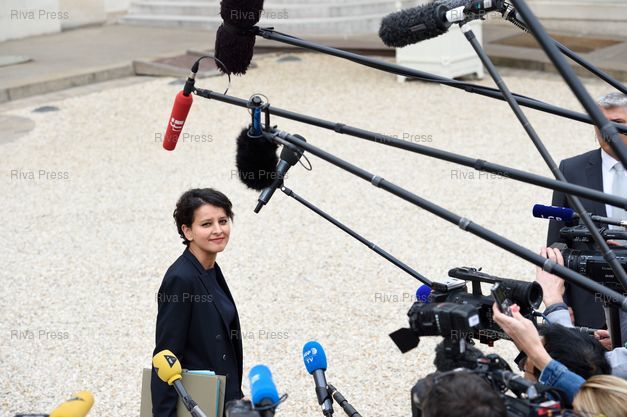 Mots-clés : 2015, Conseil des Ministres, Elysée, Journalistes, Micros, Ministre, Najat Belkacem, Najat Vallaud Belkacem, Paris, perches, presse