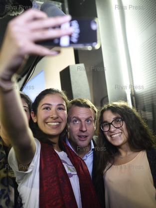 Légende : Emmanuel Macron Ministre de l'Economie, de l'Industrie et du Numérique, visite l'Ecole 42 à l'occasion de la Conférence numérique franco-allemande, et échange avec les étudiants sur les nouvelles opportunités économiques liées à la transformation numérique de l'économie et sur la stratégie numérique européenne. Des étudiantes font un selfie avec Emmanuel Macron - Paris - 27/10/2015 - Photo © Lionel Préau +33 (0)6 68 12 83 77