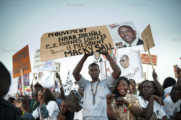 Légende : 23/03/2012 - DAKAR, Senegal - Des milliers de personnes assistent au dernier grand meeting de campagne du candidat a l'election presidentielle senegalaise Macky Sall dans le quartier de Diamalaye a Dakar, deux jours avant le vote du second tour. /// Thousands of persons attend the final campaign rally of candidate Macky Sall in the Diamalaye neighborhood of Dakar /// Vincent BOISOT/Riva Press