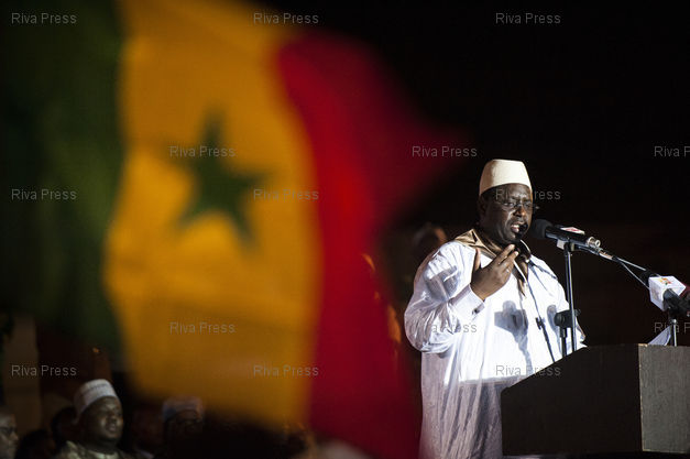 Légende : 23/03/2012 - DAKAR, Senegal - Devant des milliers de personnes, le candidat a l'election presidentielle senegalaise Macky Sall est a la tribune pour son dernier grand meeting de campagne dans le quartier de Diamalaye a Dakar, deux jours avant le vote du second tour. /// Thousands of persons attend the final campaign rally of candidate Macky Sall in the Diamalaye neighborhood of Dakar /// Vincent BOISOT/Riva Press
