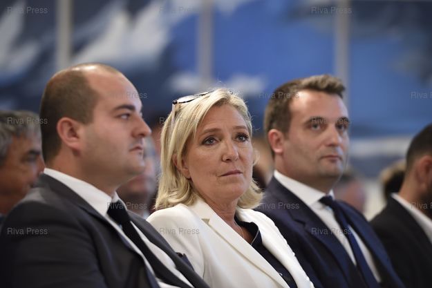Légende : Convention présidentielle Marine 2017 " Redresser l'école et l'enseignement supérieur " avec les Collectifs Racine et Marianne - Forum de Grenelle. Marine Le Pen, présidente du Front National et candidate à l'élection présidentielle, entourée par David Rachline, maire de Fréjus et directeur de campagne de Marine Le Pen pour 2017, et Florian Philippot, vice-président du FN /// Presidential convention "Marine 2017" on the recovery of school and higher education, with the Collective Racine and Marianne - Forum de Grenelle. Marine Le Pen, President of the Front National Party, and candidate to the presidential election, with David Rachline (L), Major of Fréjus and Director of the campaign of Marine Le Pen for 2017, and Florian Philippot, Vice-President of the FN Party - Paris - 22/09/2016 - Photo © Lionel Préau +33 (0)6 68 12 83 77