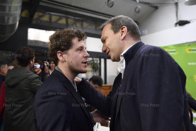 Caption : Yannick Jadot, candidat EELV à la présidentielle, présente ses voeux et son projet présidentiel à la presse - Espace Volumes. Julien Bayou et David Cormand, secrétaire national d'Europe Ecologie Les Verts - Paris - 11/01/2017 - Photo © Lionel Préau +33 (0)6 68 12 83 77