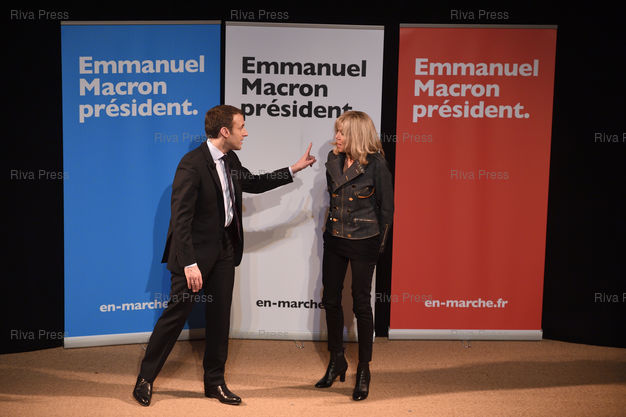 Caption : Emmanuel Macron, candidat du mouvement "En Marche !" à l'élection présidentielle, participe à l'événement organisé par "Elles Marchent !" à l'occasion de la journée internationale des droits des femmes - Théâtre Antoine. En présence de Brigitte Trogneux, épouse d'Emmanuel Macron /// Emmanuel Macron, candidate of the movement "En Marche !" to the presidential election, participates to the event organized by "Elles Marchent !" on International Women's Day - Théâtre Antoine. With Brigitte Trogneux, wife of Emmanuel Macron - Paris- 08/03/2017 - Photo © Lionel Préau +33 (0)6 68 12 83 77