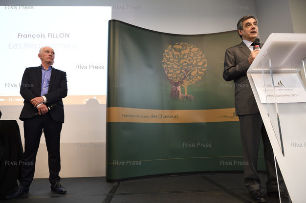 Légende : François Fillon, candidat Les Républicains à l'élection présidentielle, intervient devant la Fédération Nationale des Chasseurs à l'occasion de son assemblée générale, en présence de Thierry Coste, conseiller politique de la FNC - Paris - 14/03/2017 - Photo © Lionel Préau +33 (0)6 68 12 83 77