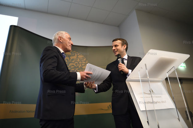 Légende : Emmanuel Macron, candidat du mouvement En Marche ! à l'élection présidentielle, intervient devant la Fédération Nationale des Chasseurs (FNC) à l'occasion de son assemblée générale. En présence de Thierry Coste, conseiller politique de la FNC /// Emmanuel Macron, candidate of the En Marche ! movement to the presidential election, adresses the Hunters National Federation on occasion of its general meeting. With Thierry Coste, political advisor of the FNC - Paris - 14/03/2017 - Photo © Lionel Préau +33 (0)6 68 12 83 77