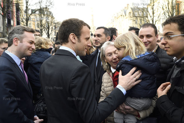 Légende : Emmanuel Macron, candidat du mouvement "En Marche !" à l'élection presidentielle, et François Bayrou dans les rues de Reims avant un meeting. En présence de Jean-(Baptiste Lemoyne, senateur /// Emmanuel Macron, candidate of the movement "En Marche !" to the presiderntial election, in the streets of Reims prior to a meeting. With Jean-Baptiste Lemoyne, senator - Reims - 17/03/2017 - Photo © Lionel Préau +33 (0)6 68 12 83 77