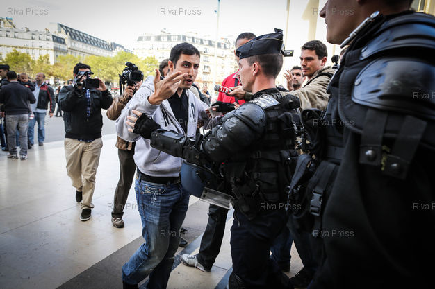 Légende : Alors que toute manifestation a ete interdite. Des policiers et des gardes mobiles procedent a des controles d'identite et a l'arrestation de musulmans sur la place du Trocadero et du 11 novembre. Paris, FRANCE-22/09/2012