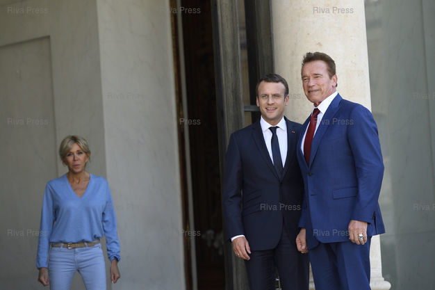 Légende : Emmanuel Macron reçoit Arnold Schwarzenegger, vice-président et fondateur de R20 (Regions of climate action), au palais de l'Elysée, la veille du lancement à Paris du " pacte mondial pour l'environnement ". En présence de Brigitte Macron /// Emmanuel Macron receives Arnold Schwarzenegger, Vice President and Founder of R20 (Regions of Climate Action), at the Elysee Palace, the day before the launching of the " Global Pact for the Environment ". With Brigitte Macron - Paris - 23/06/2017 - Photo © Lionel Préau +33 (0)6 68 12 83 77