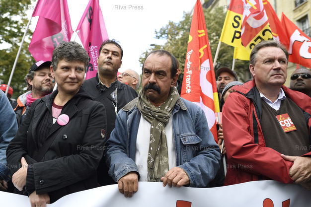 Légende : Manifestation contre la réforme du code du travail par ordonnances, à l'appel des syndicats CGT, Solidaires et FSU. Cécile Gondard-Lalanne, porte-parole de Solidaires - Philippe Martinez, secrétaire général de la CGT /// Demonstration against the labor law reform by order, called by the CGT, Solidaires and FSU trade unions. Cécile Gondard-Lalanne, spokesperson of Solidaires - Philippe Martinez, general secretary of the CGT - Paris - 12/09/2017 - Photo © Lionel Préau +33 (0)6 68 12 83 77