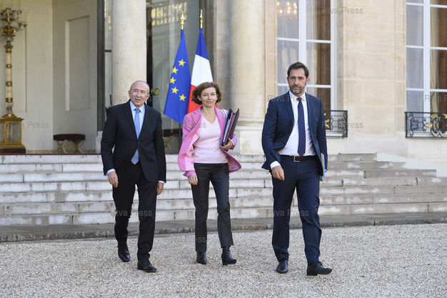 Légende : Conseil des ministres au palais de l'Elysée. Gérard Collomb, ministre d'Etat, ministre de l'Intérieur - Florence Parly, ministre des Armées - Christophe Castaner, secrétaires d'Etat chargé des Relations avec le Parlement, porte-parole du Gouvernement /// Cabinet meeting at the Elysee Palace. Gérard Collomb, Minister of State, Minister of the Interior - Florence Parly, Minister of the Armed Forces - Christophe Castaner, Junior Minister in charge of the Relations with the Parliament, Spokesperson of the Government - Paris - 14/09/2017 - Photo © Lionel Préau +33 (0)6 68 12 83 77