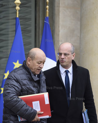 Légende : Conseil des ministres au palais de l'Elysée. Jean-Yves Le Drian, ministre de l'Europe et des Affaires étrangères - Jean-Michel Blanquer, ministre de l'Education nationale /// Cabinet meeting at the Elysee Palace. Jean-Yves Le Drian, Minister of Europe and Foreign Affairs - Jean-Michel Blanquer, Minister of National Education - Paris - 20/12/2017 - Photo © Lionel Préau +33 (0)6 68 12 83 77