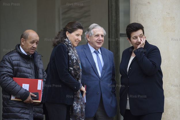 Légende : Conseil des ministres au palais de l'Elysée. Jean-Yves Le Drian, ministre de l'Europe et des Affaires étrangères - Agnès Buzyn, ministre des Solidarités et de la Santé - Jacques Mézard, ministre de la Cohésion des territoires - Frédérique Vidal, ministre de l'Enseignement supérieur, de la Recherche et de l'Innovation /// Cabinet meeting at the Elysee Palace. Jean-Yves Le Drian, Minister of Europe and Foreign Affairs - Agnès Buzyn, Minister of the Solidarities and Health - Jacques Mézard, Minister of the Territories Cohesion - Frédérique Vidal, Minister of Higher Education, Research and Innovation - Paris - 12/01/2018 - Photo © Lionel Préau +33 (0)6 68 12 83 77