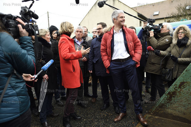 Légende : Laurent Wauquiez, Président des Républicains, et Valérie Pécresse, Présidente de la Région Ile-de-France, présidente du mouvement "Soyons libres !" associé aux Républicains, apportent leur soutien à Antoine Savignet, candidat LR à l'élection législative partielle dans la 1ère circonscription du Val d'Oise, lors de la visite d'une exploitation agricole à Saillancourt /// Laurent Wauquiez, President of the Les Republicains Party, and Valérie Pécresse, President of the Ile-de-France Region, President of the "Soyons libres !" movement associated to Les Républicains, support Antopine Savignet, LR candidate to the by-election in the 1st district of the Val d'Oise, during a visit of an agricultural exploitation - Saillancourt - 31/01/2018 - Photo © Lionel Préau +33 (0)6 68 12 83 77