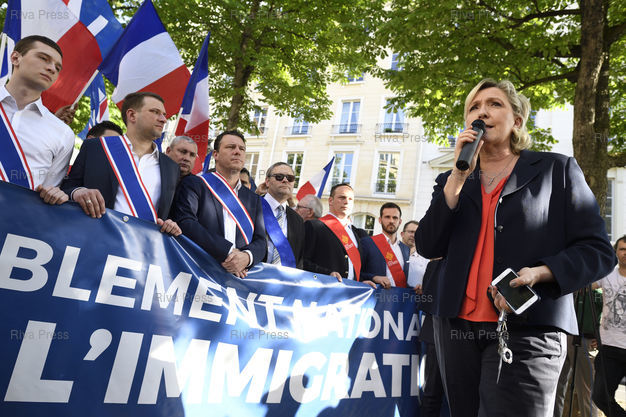 Caption : Le Front national proteste devant l'Assemblée nationale contre le projet de loi asile et immigration du gouvernement. En présence de Marine Le Pen, présidente du FN, Jordan Bardella, Jean-Lin Lacapelle /// The far-right Front National Party protests in front of the National Assembly against the government's asylum and immigration bill. With Marine Le Pen, President of the Front National Party, Jordan Bardella, Jean-Lin Lacapelle - Paris - 20/04/2018 - Photo © Lionel Préau +33 (0)6 68 12 83 77