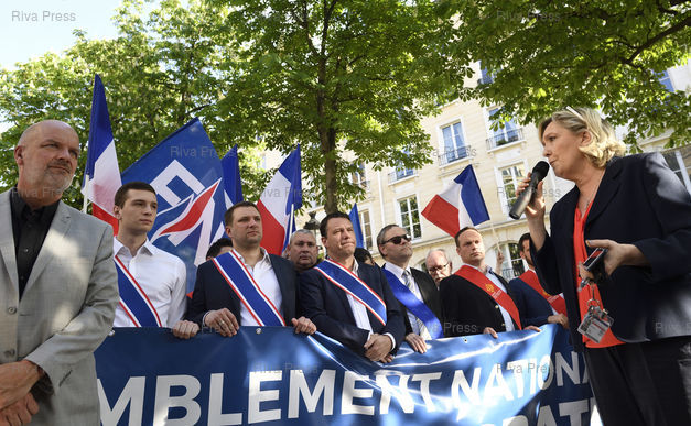 Légende : Le Front national proteste devant l'Assemblée nationale contre le projet de loi asile et immigration du gouvernement. En présence de Marine Le Pen, présidente du FN, Thierry Légier, Jordan Bardella, Jean-Lin Lacapelle /// The far-right Front National Party protests in front of the National Assembly against the government's asylum and immigration bill. With Marine Le Pen, President of the Front National Party, Thierry Légier, Jordan Bardella, Jean-Lin Lacapelle - Paris - 20/04/2018 - Photo © Lionel Préau +33 (0)6 68 12 83 77