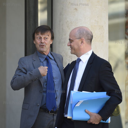 Légende : Conseil des ministres au palais de l'Elysée. Nicolas Hulot, ministre d'Etat, ministre de la Transition écologique et solidaire - Jean-Michel Blanquer, ministre de l'Education nationale /// Cabinet meeting at the Elysee Palace. Nicolas Hulot, Minister of State, Minister of Ecological and Concerted Transition - Jean-Michel Blanquer, Minister of National Education - Paris - 27/04/2018 - Photo © Lionel Préau +33 (0)6 68 12 83 77