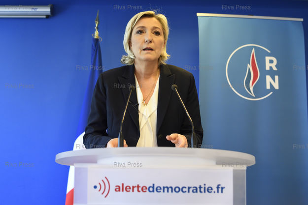 Légende : Marine Le Pen, présidente du Rassemblement national (ex-Front national), s'exprime après que la justice a annoncé, dans le cadre de l'affaire des assistants présumés fictifs d'eurodéputés, confisquer les 2 millions d'euros d'aides publiques d'Etat. Selon Marine Le Pen, le parti "ne pourra plus payer ses salariés à partir du mois d'août" /// Marine Le Pen, President of the Rassemblement National far-right Party (ex-Front National), speaks after the justice announced, in the case of the presumed fictitious assistants of MEPs, confiscate the 2 million euros of state aid. According to Marine Le Pen, the party "will not be able to pay its employees from the month of August" - Nanterre - 09/07/2018 - Photo © Lionel Préau +33 (0)6 68 12 83 77