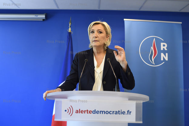 Légende : Marine Le Pen, présidente du Rassemblement national (ex-Front national), s'exprime après que la justice a annoncé, dans le cadre de l'affaire des assistants présumés fictifs d'eurodéputés, confisquer les 2 millions d'euros d'aides publiques d'Etat. Selon Marine Le Pen, le parti "ne pourra plus payer ses salariés à partir du mois d'août" /// Marine Le Pen, President of the Rassemblement National far-right Party (ex-Front National), speaks after the justice announced, in the case of the presumed fictitious assistants of MEPs, confiscate the 2 million euros of state aid. According to Marine Le Pen, the party "will not be able to pay its employees from the month of August" - Nanterre - 09/07/2018 - Photo © Lionel Préau +33 (0)6 68 12 83 77