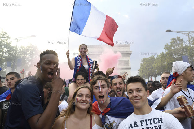 Légende : Des supporters de football fêtent sur l'avenue des Champs-Elysées la victoire de la France contre la Croatie en finale de la Coupe du Monde /// Football fans celebrate on the Avenue des Champs Elysees the victory of France against Croatia in the final of the World Cup - Paris - 15/07/2018 - Photo © Lionel Préau +33 (0)6 68 12 83 77